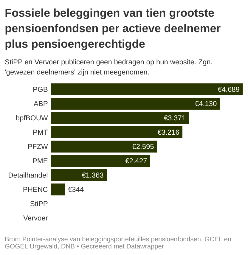Pointer legde fossiele aandelen en obligaties van 10 grote pensioenfondsen naast een lijst met kolenbedrijven, de Global Coal Exit List van de NGO Urgewald. In deze lijst worden bedrijven opgenomen die voor een belangrijk deel in de bruin- en steenkoolindustrie zitten, bedoeld om energie mee op te wekken. Uit de analyse van Pointer blijkt dat PGB, het pensioenfonds voor de sociale sector, met 4.689 euro per pensioendeelnemer en -ontvanger het fonds is met de meeste fossiele beleggingen. ABP (4130 euro per deelnemer) en bpfBOUW (3.371 euro per deelnemer) staan op plek twee en drie.