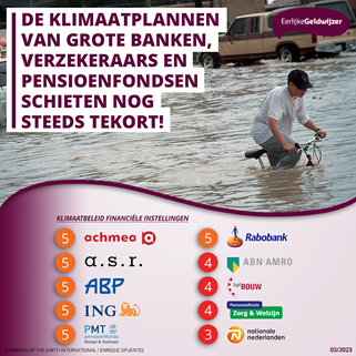 De klimaatplannen van grote financiële instellingen zoals ING, Nationale Nederlanden en PFZW schieten ernstig tekort. Hun huidige plannen zijn van onvoldoende kwaliteit om aan te tonen dat ze in lijn zijn met het doel om de opwarming van de aarde te beperken tot 1,5°C, zoals afgesproken in de VN-klimaatakkoorden van Parijs en Glasgow. Dat blijkt uit nieuw onderzoek van de Eerlijke Geldwijzer naar de klimaatplannen van de tien grootste Nederlandse banken, verzekeraars en pensioenfondsen, dat vandaag gepubliceerd wordt. Geen van de onderzochte financiële instellingen haalt een voldoende voor hun klimaatplan. Achmea, ASR, ABP, ING, PMT en Rabobank halen een 5. ABN Amro, BpfBouw en PFZW krijgen een 4. Hekkensluiter NN Group (Nationale Nederlanden) komt niet verder dan een 3.