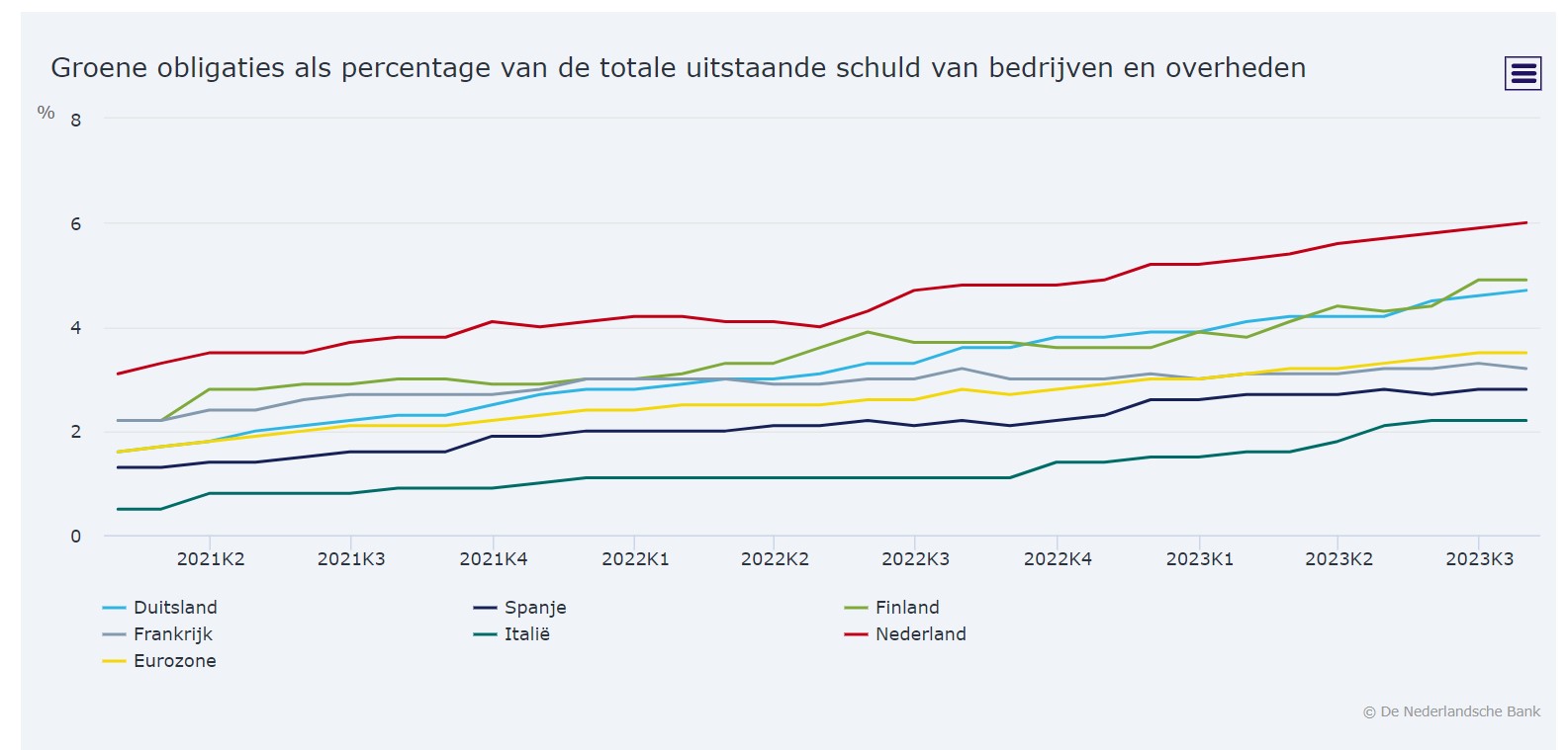 In Europees verband zijn Nederlandse bedrijven en overheden koploper op het gebied van groene obligaties als deel van de totale uitstaande schuld. Eind juli 2023 bedroeg dit percentage voor Nederland 6,0%. Finland en Duitsland volgen met respectievelijk 4,9% en 4,7%.