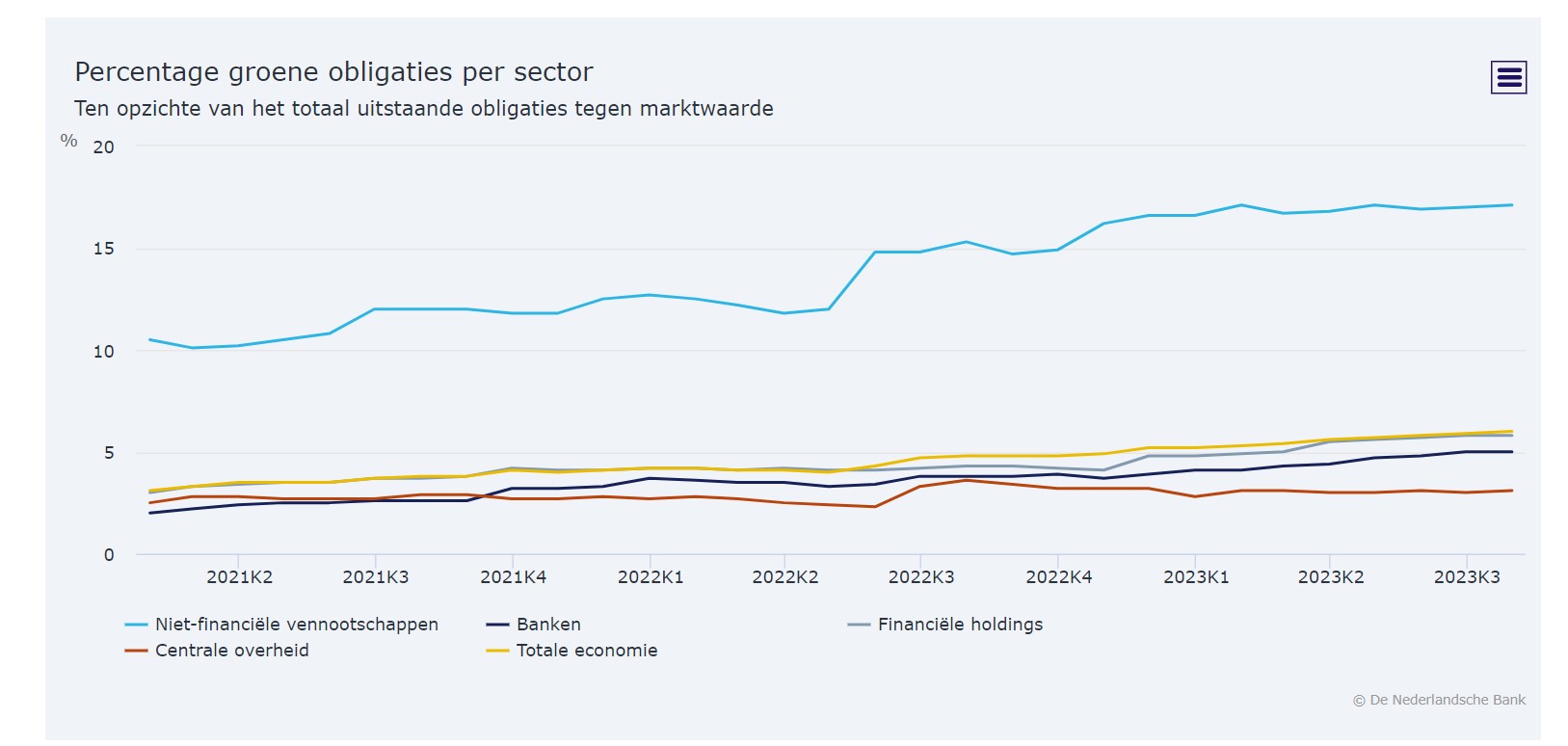 Naast de financiële holdings stuwen ook niet-financiële bedrijven (ondernemingen die goederen en niet-financiële diensten produceren) de uitgifte van groene obligaties. Deze sector geeft al langere tijd relatief de meeste groene obligaties uit. Eind juli 2023 bedroeg voor deze sector het aandeel groene obligaties – als percentage van de totale uitstaande schuld voor deze bedrijven – 17,1% (€ 31 miljard). De sectoren financiële holdings (5,8%, of € 44 miljard) en banken (5,0%, of € 27 miljard) volgen. De centrale overheid financiert 3,2% van haar schuld met groen kapitaal. Dit betreft vooralsnog één uitstaande obligatie(Verwijst naar een externe site) met een marktwaarde van iets meer dan € 11 miljard per eind juli 2023.
