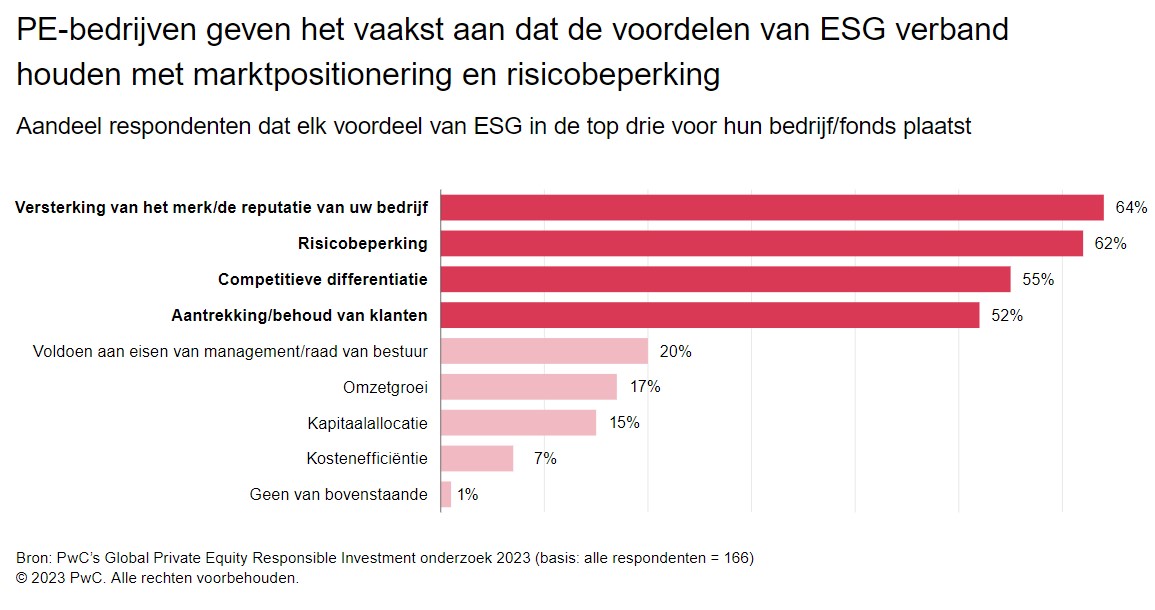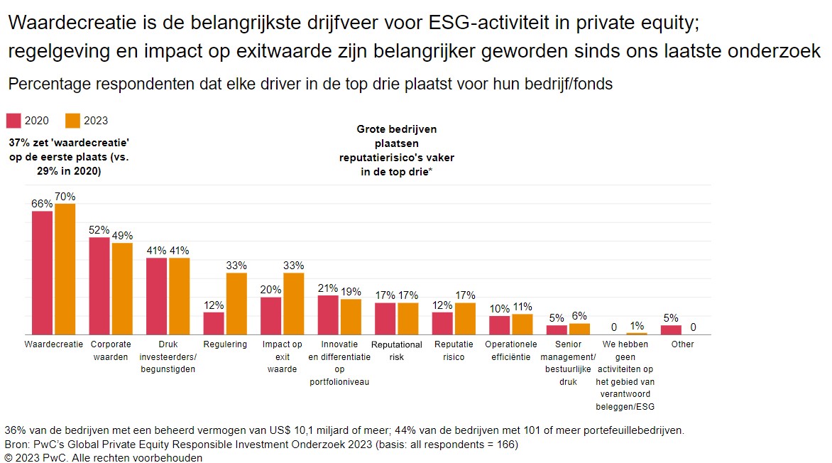 - Erkenning van waardecreatie: Private equitybedrijven erkennen in toenemende mate de waarde van ESG, waarbij zeventig procent het beschouwt als een van de drie belangrijkste drijfveren.