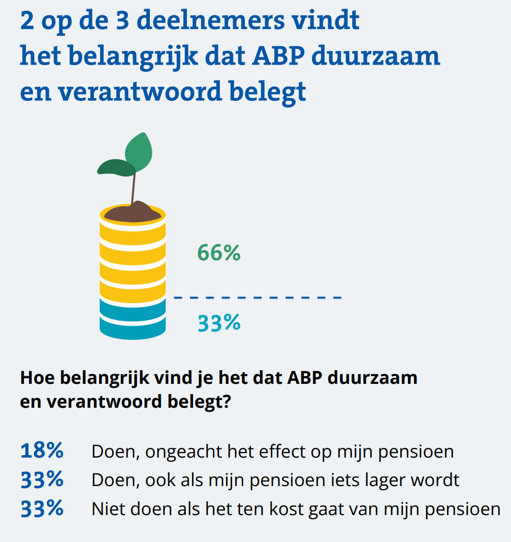 In de resultaten is terug te zien dat 2 op de 3 deelnemers duurzaam en verantwoord beleggen belangrijk vindt. 51% vindt dat ABP duurzaam en verantwoord moeten beleggen, zelfs wanneer hun pensioen iets lager wordt. Deelnemers vinden dat ABP steeds duurzamer en verantwoorder is gaan beleggen. Deelnemers beoordelen dit met een rapportcijfer 7, het hoogste sinds 2015.