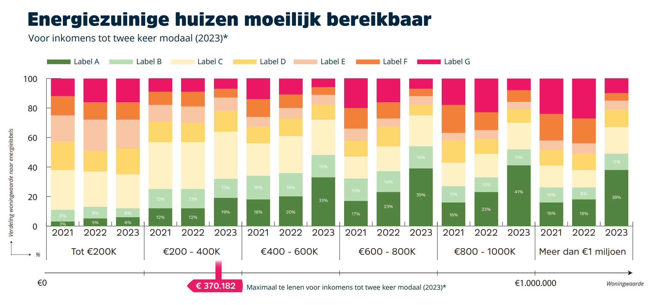 “Er zijn op dit moment marktinitiatieven waarbij er alleen een lagere rente wordt gerekend voor hypotheken met label A of beter”, zegt Lageman. Natuurlijk is het volgens haar mooi om goed gedrag te belonen. “Echter, de grootste winst is te behalen voor huishoudens met een inkomen tot twee keer modaal die vaker aangewezen zijn op woningen met een slechter label. Onze analyse laat zien dat hun kans om in een huis met energielabel A of B te wonen, kleiner is dan bij de hogere inkomensgroepen.” Lageman wijst er verder op dat het prijsverschil tussen een gemiddelde woning met energielabel G en energielabel A tussen 2020 en 2023 is opgelopen naar €140.000.2 ‘“Al met al is er is in korte tijd een ongewenste tweedeling in de woningmarkt aan het ontstaan.”