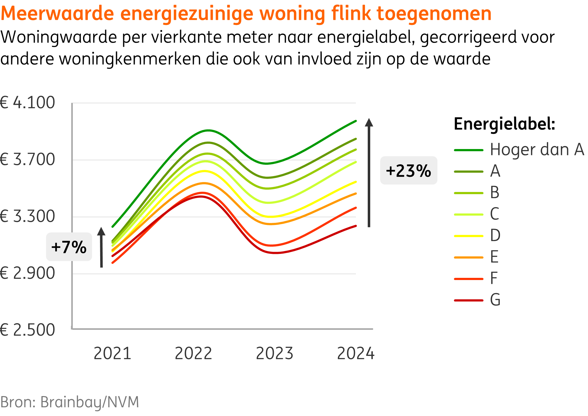 *In het onderzoek van Brainbay wordt gebruikt gemaakt van een woningwaardemodel op basis van woningtransacties van de NVM. Het model kan het effect van een energielabel isoleren en zo de waarde van een energielabel zuiver schatten.