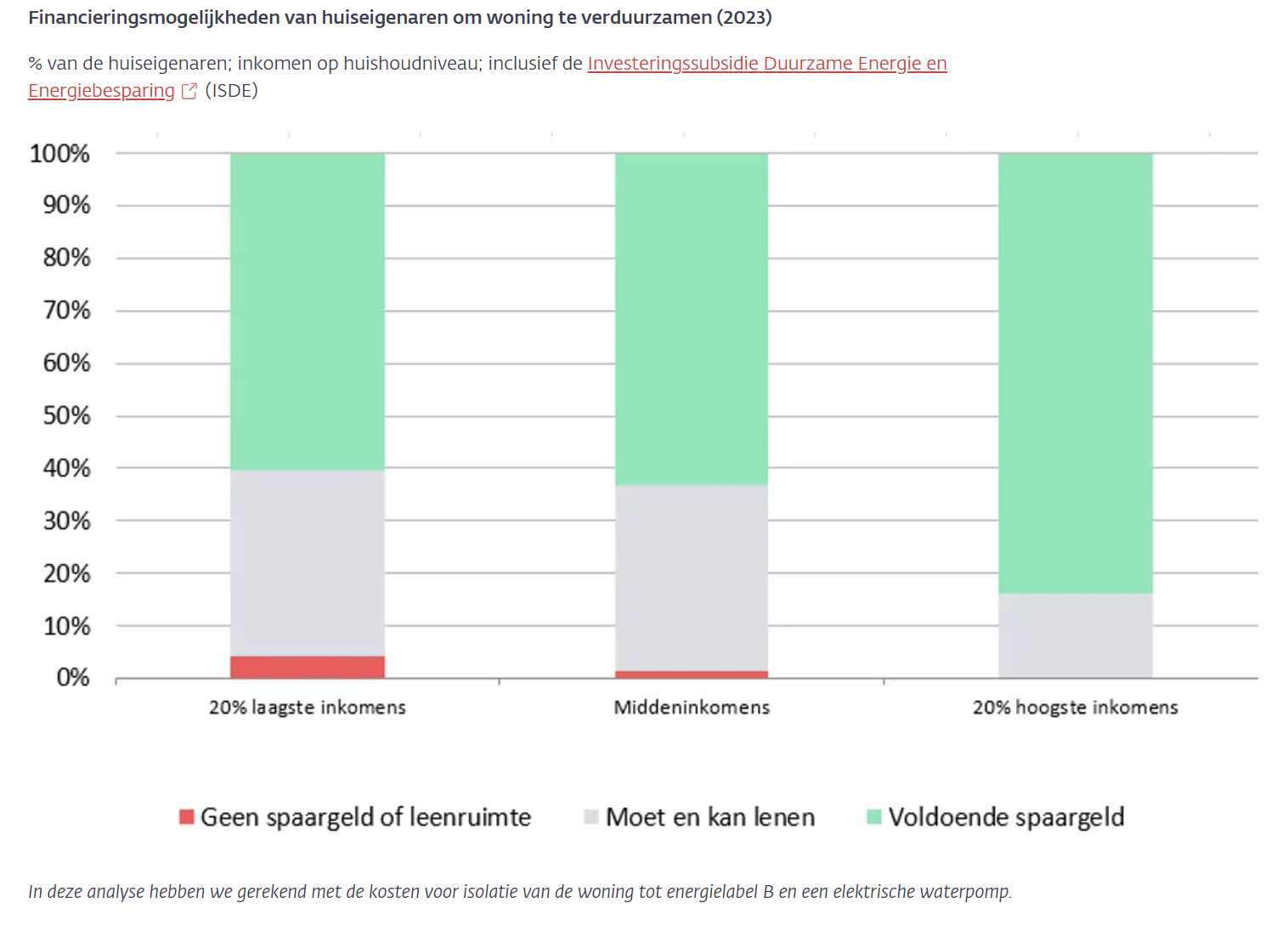 Belangrijke factor voor het verduurzamen van woningen, is de financiering. Volgens schattingen op basis van CBS-Microdata kan 95% van de huiseigenaren de investeringskosten van verduurzaming van de eigen woning (isolatie tot energielabel B en elektrische warmtepomp) financieel dragen met spaargeld of een lening binnen de maximale leennormen, waarbij ze een financiële buffer aanhouden van €10.000. De meeste huiseigenaren (66%) hebben voldoende spaargeld dat ze zouden kunnen aanwenden voor het verduurzamen van hun huis. Bijna alle andere huiseigenaren (29%) hebben de mogelijkheid om verduurzaming te financieren met een lening binnen de maximale leennormen, of (3%) kan dit financieren door gebruik te maken van de Energiebespaarlening(Verwijst naar een externe site) (EBL) van het Warmtefonds. Ook in de laagste inkomensgroep kunnen veruit de meeste huiseigenaren verduurzaming financieren (96%) met spaargeld, een lening binnen de maximale leennormen of de EBL.
