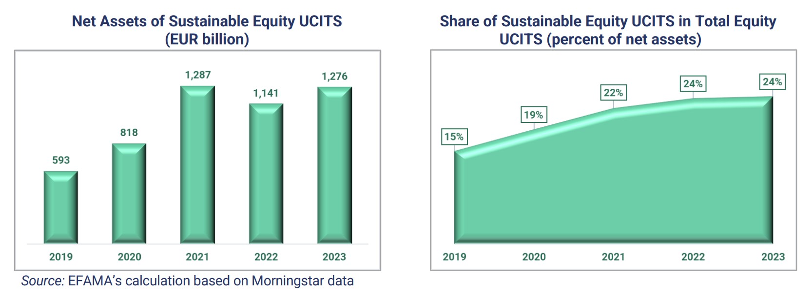 - Duurzame equity UCITS vormden 24% van de totale duurzame UCITS in 2023, tegen 15% in 2019. De nettoactiva van deze fondsen zijn de afgelopen vijf jaar meer dan verdubbeld, van EUR 0,6 biljoen naar EUR 1,3 biljoen.