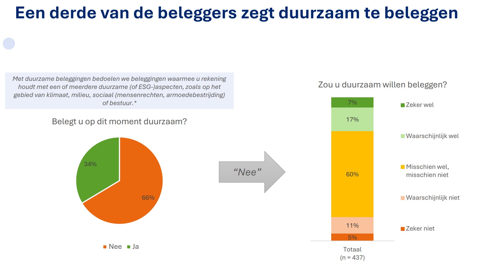 Een derde van de beleggers in de Consumentenmonitor geeft aan duurzaam te beleggen. De meerderheid kijkt naar de naam van de belegging om te bepalen of het aansluit op hun duurzaamheidsvoorkeuren. Ongeveer een kwart van de andere beleggers geeft aan duurzaam te willen beleggen. De belangrijkste reden voor de (potentiële) duurzame beleggers is dat zij hiermee voor een positieve verandering in de wereld willen zorgen. Van de beleggers die beleggen met advies of via vermogensbeheer geeft 40% aan dat ze graag willen dat rekening wordt gehouden met hun duurzaamheidsvoorkeuren. Bij slechts 25% is hiernaar gevraagd. Het is voor vermogensbeheerders en beleggingsadviseurs verplicht om dit uit te vragen. De transitie naar een duurzame samenleving is een van de grootste uitdagingen van deze tijd. De AFM moedigt de financiële sector aan haar belangrijke rol hierin te vervullen.