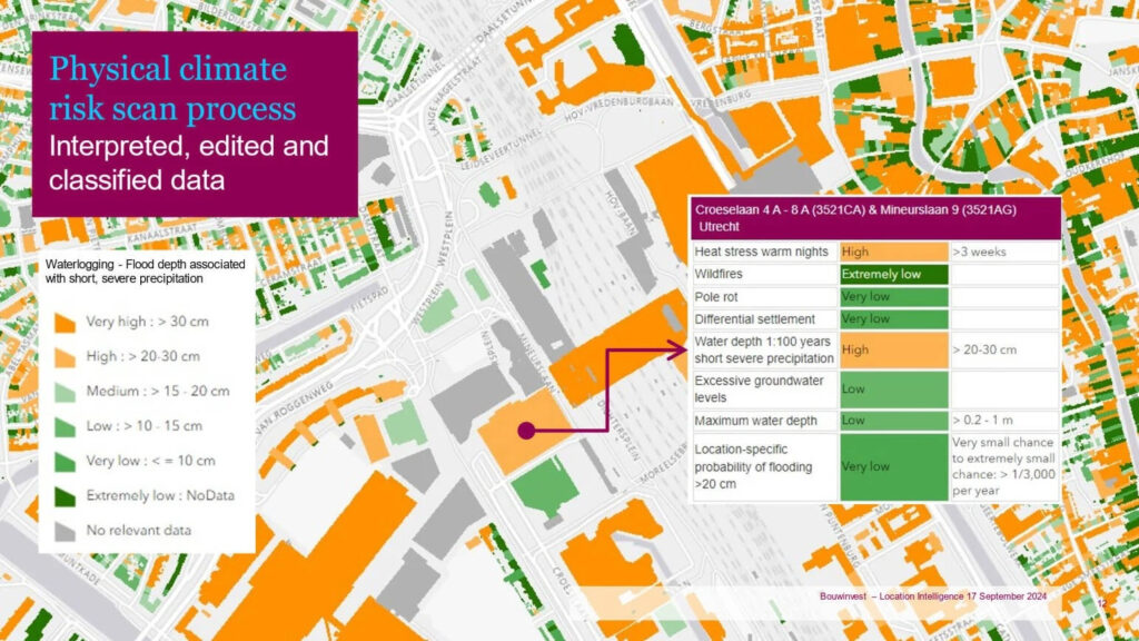 Vastgoedinvesteerder Bouwinvest zet een belangrijke stap in klimaatadaptatie door de implementatie van een innovatieve klimaatscan, gebaseerd op GIS (Geografische Informatie Systemen)-technologie van Esri. Door klimaatrisicodata te koppelen aan de vastgoedportefeuille, ontstaat inzicht in de impact van extreme weersomstandigheden op de vastgoedportefeuille. Dit stelt Bouwinvest in staat om weloverwogen beslissingen te nemen voor zowel bestaande als nieuwe investeringen en meer maatschappelijke en financiële waarde te creëren.