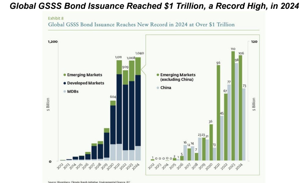 Amundi, the largest European asset manager and IFC, a member of the World Bank Group, have unveiled their Emerging Market Green Bonds annual report. Green, social, sustainability, and sustainability-linked bonds (GSSS) are a relatively young asset class, established with the first green bond transactions just over a decade ago. This analysis shows that global GSSS bond issuance hit an all-time high of over $1 trillion in 2024 on a gross basis, up 3% from a year earlier. However, the asset class’s share of total fixed income issuance declined to 2.2% in 2024 from 2.5% the previous year. This remains well above the levels of 0.6% seen in 2018.