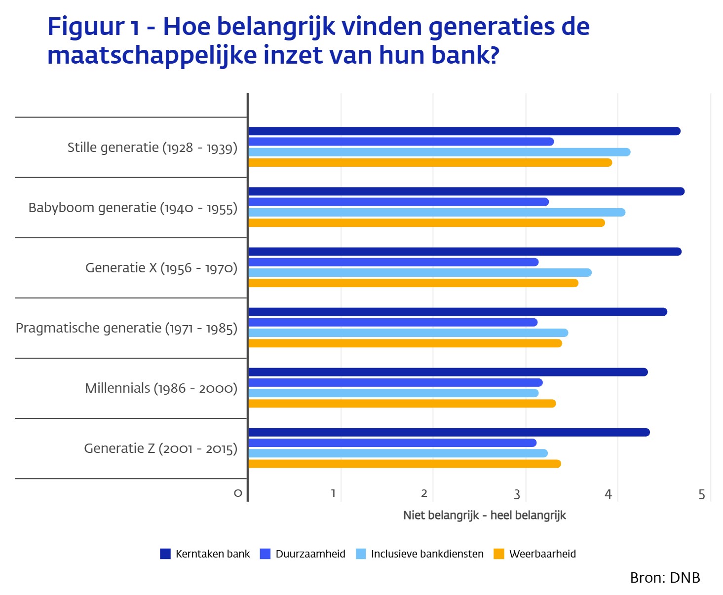 Alle generaties bankklanten vinden het belangrijk dat hun bank bijdraagt aan maatschappelijke weerbaarheid, sociale inclusie en duurzaamheid, maar de oudste generaties waarderen deze inspanningen nog wat hoger dan de anderen, zie figuur 1.