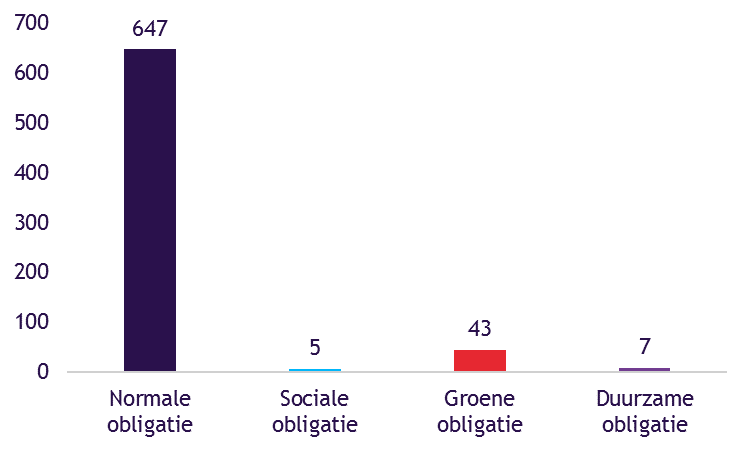 De bovenstaande grafiek bevestigt dat er te weinig emittenten van groene obligaties zijn om een gediversifieerde IG-creditportefeuille te kunnen samenstellen en alpha toe te voegen door de juiste obligaties te kiezen of een sectorbenadering aan te houden. Het is dan ook aanbevelenswaardig om zowel ‘sociale’ obligaties (waarvan de opbrengst wordt gebruikt voor sociale projecten) als duurzame obligaties (combinatie van groene en sociale obligaties) op te nemen, hoewel deze voornamelijk worden uitgegeven door non-profit organisaties e.d. Daarnaast is er slechts een beperkt aantal uitgevers actief op de kredietmarkt. Wanneer dan ook nog rekening wordt gehouden met de spreiding van kredietbeoordelingen, levert dit nog minder onderscheid op, gezien het beperkte aantal ondernemingen en het feit dat de meeste een waardering van A/BBB hebben.