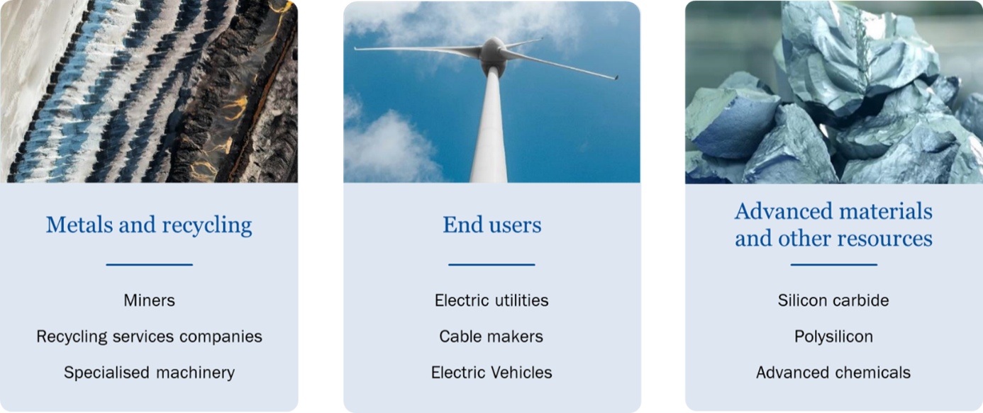 Beleggen in de waardeketen van strategische materialen helpt deze risico’s te beperken en zorgt voor diversificatie, wat de prestaties in verschillende fasen van de cyclus ten goede komt. We passen deze benadering van de waardeketen toe op onze thematische aandelenfranchise. Voor strategische materialen richten we ons specifiek op drie groepen bedrijven: metalen en recycling, eindgebruikers en geavanceerde materialen en andere hulpbronnen.