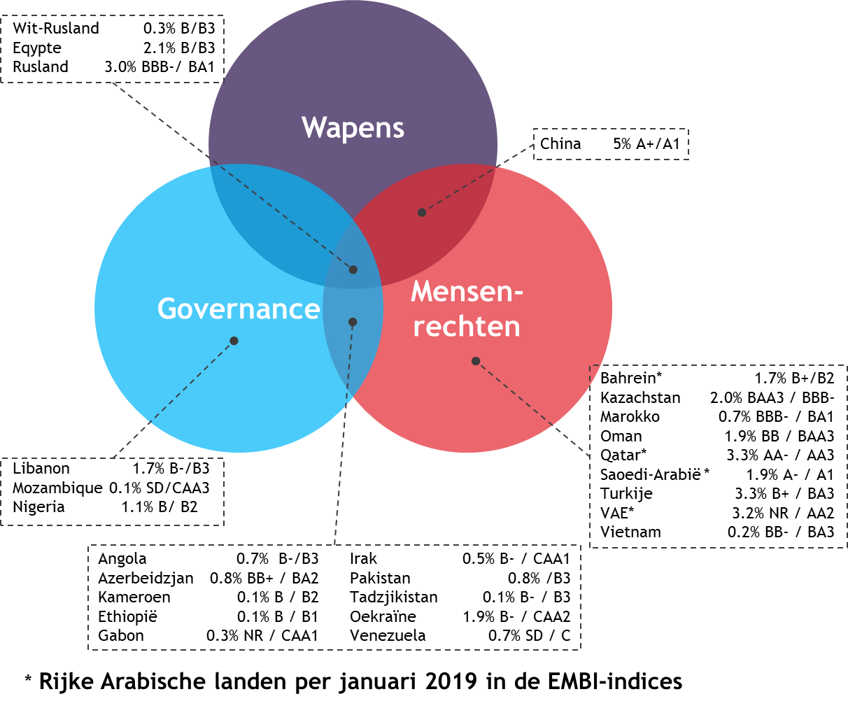 Op basis van onze eigen criteria zouden vier van de vijf landen van het beleggingsuniversum worden uitgesloten. Alleen Koeweit komt op basis van data van Freedom of the World 2019 voor belegging in aanmerking: