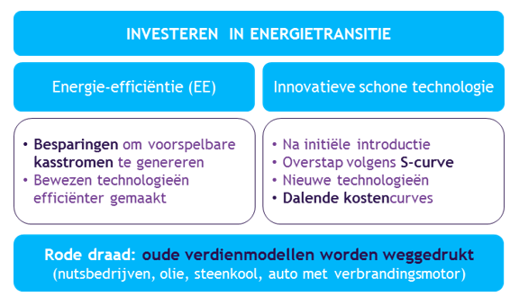 Investeringen in energie-efficiëntie leiden tot besparingen die direct margeverhogend zijn voor een bedrijf en vrije kasstromen creëren. Tegelijkertijd zijn de risico’s beperkt, omdat energiebesparingen veelal kunnen worden gerealiseerd met bewezen technologieën. Daarnaast zijn de CO2-reducerende effecten gelijk of beter dan voor bijvoorbeeld hernieuwbare energie. Kansen op het vlak van energie-efficiëntie kunnen vooral gezocht worden in de industrie, in vastgoed of in recycling. Vaak zijn de maatregelen gebundeld en omvatten ze bijvoorbeeld isolatie, LED-verlichting, warmtepompen, ventilatie met warmteterugwinning, warmte- en koudeopslag, thermische zonne-energie, sensorsystemen, batterijopslag, warmtekracht-koppelingssystemen, afvalwarmte-, biomassa- en biogasinstallaties en niet in de laatste plaats het recyclen van steeds meer materialen. Initiatieven voor het implementeren van energiebesparende maatregelen zullen de komende jaren en decennia versnellen, ook omdat de besparingen leiden tot een aantrekkelijk rendement op investeringen.