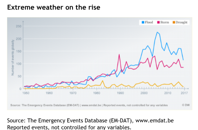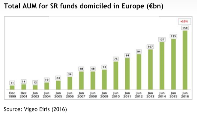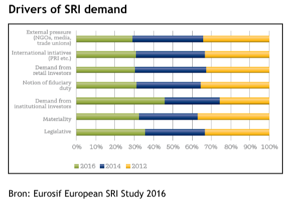 De verhoogde risico’s die gepaard gaan met klimaatverandering, sociale en demografische ontwikkelingen alsook de invloed daarvan, trekken steeds meer de aandacht van internationale organisaties en toezichthouders. Europa neemt vaker het voortouw op het gebied van regelgeving ter bevordering van duurzaam beleggen en vergroting van transparantie door bedrijven en beleggers. Zo treedt volgend jaar de Europesen IORP II-richtlijn in werking, op grond waarvan pensioenfondsen verplicht worden bij hun algemene risicobeheer en verslaggeving rekening te houden met risico’s op het gebied van milieu, samenleving en bestuur.Daarnaast bestudeert de EU High-Level Expert Group maatregelen voor het financieren van duurzame groei. Regelgevingsbeleid, veranderende voorkeuren van de consument en een exponentieel groeiende hoeveelheid data die onze uitdagingen op het gebied van milieu en maatschappij bevestigen (zie onderstaande grafiek), vormen een belangrijke basis voor het creëren van een situatie in Europa waarin zowel ondernemingen als beleggers deel kunnen nemen in een duurzamere economie.