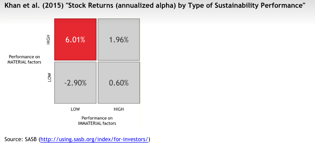 Het selecteren van ondernemingen die hoog scoren op het gebied van ESG en het vermijden van slecht-scorende bedrijven is niet alleen van belang voor het duurzaamheidsprofiel van de portefeuille. Onderzoek wijst uit dat bedrijven die slecht scoren op ESG-onderdelen en die een grote financiële impact hebben, slechter renderen dan ondernemingen die op die gebieden wél goed scoren. Dit wordt weergegeven in de zogeheten Materiality Map van de Sustainability Accounting Standards Board – SASB (zie onderstaande figuur). De performance is dus niet alleen gebaat bij een positief ESG-effect maar ook bij het vermijden van ondernemingen die op dat gebied slecht scoren.