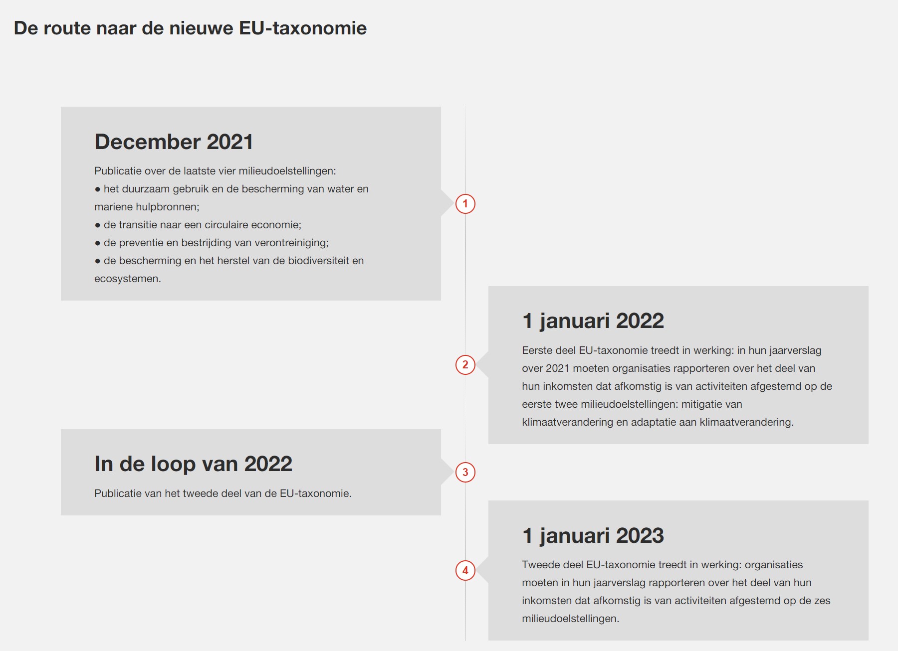 Op dit moment zijn alleen voor de eerste twee doelstellingen criteria ontwikkeld om te beoordelen of een economische activiteit aan de taxonomie voldoet. In de loop van 2022 worden de criteria voor de overige doelstellingen ook bekend. Vanaf 1 januari 2023 moeten niet-financiële bedrijven ook voor de andere vier doelstellingen rapporteren over het deel van hun inkomsten dat afkomstig is van activiteiten afgestemd op de EU-taxonomie.