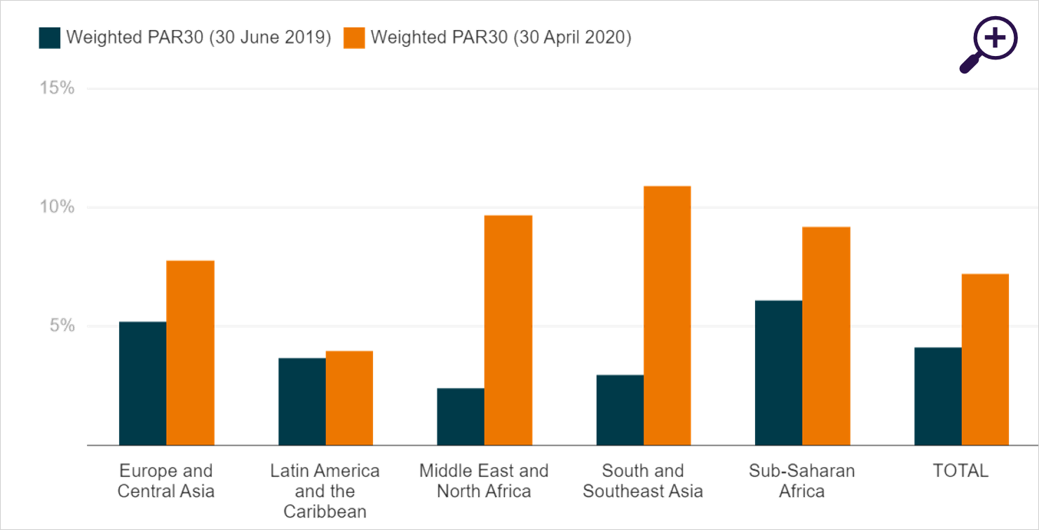 De impact van de Covid-19-crisis op FII’s kan daarom ook in dat kader worden bekeken. Opwaarts kan de liquiditeitssteun van commerciële kredietverleners – zowel ontwikkelingsbanken als internationale (impact-) investeerders– gevaarlopen, aangezien zij ook de economische crisis moeten trotseren. Afwaarts hebben de opgelegde lockdowns een enorme impact op de eindklant aangezien mensen niet in staat zijn hun kleine onderneming te runnen, ze minder geld uit het buitenland ontvangen van familie en daardoor hun leningen niet kunnen aflossen. In de meeste landen heeft de overheid hierop gereageerd met moratoriums, ter ondersteuning van de eindklant. Hierdoor kunnen FII’s in een liquiditeitscrisis terechtkomen.