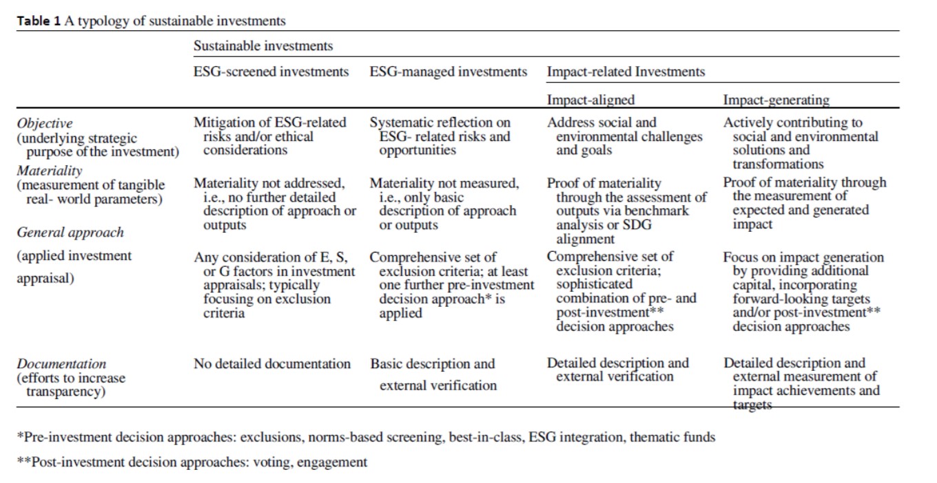 In de studie wordt een nieuwe typologie voorgesteld voor de verschillende vormen van duurzaam beleggen (zie tabel). De aandacht gaat daarbij uit naar impact investing. Het bevat een definitie en omschrijft wat het omvat. Een belangrijk onderscheid dat gemaakt wordt is dat tussen impact-aligned en impactgenerating beleggingen. De bedoeling is dat dit de beleggingspraktijk, beleidsmakers, en academici helpt de bomen door het bos te zien.