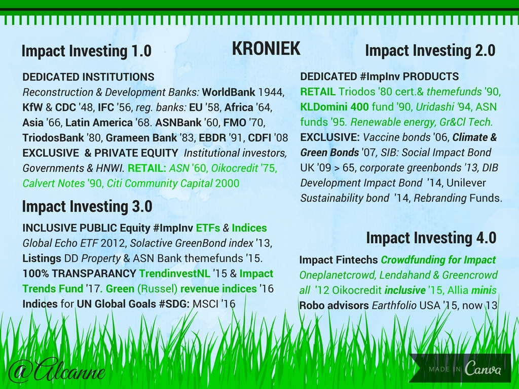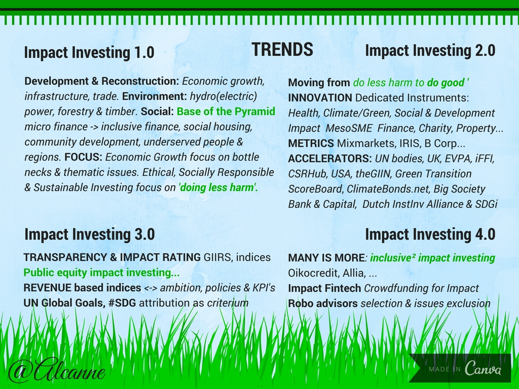 We zien de opkomst van de UN Global Goals of #SDGs en de bijdrage van bedrijven daaraan op basis van hun inkomsten als impact criterium voor public equity investments. Ik noem dit Impact Investing 3.0, want het zijn niet de minste partijen die Global Goals indices, fondsen en instrumenten ontwikkelen: MSCI, Solactive voor de Wereldbank en in Nederland TrendinvestNL dat 100% transparante producten aanbiedt.