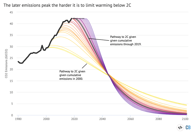 Bron: https://www.carbonbrief.org/unep-1-5c-climate-target-slipping-out-of-reach/the-later-emissions-peak-the-harder-it-is-to-limit-warming-below-2c