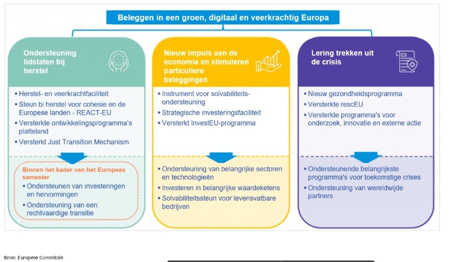 Het pakket “Next Generation EU” met een omvang van € 750 miljard wordt gebruikt om te investeren in een groene, digitale en veerkrachtige EU. Ter vergelijk: de Europese “Green Deal”, die november 2019 werd gepresenteerd, bestond uit een pakket van € 1.000 miljard en zou een decennium beslaan. Bij Next Generation EU wordt tussen 2021-2024 € 750 miljard opgehaald en gebruikt voor investeringen in een groen en digitaal Europa. Oftewel: dit is een ogenschijnlijke versnelling van de implementatie van de Europese Green Deal, die inzet op investeringen in innovatie op het vlak van duurzaamheid en digitalisering.