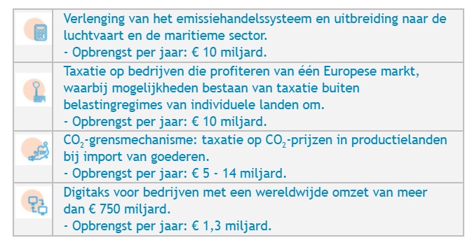 Na het zoet komt vaak het zuur. Dat geldt ook voor Next Generation EU. Het steunpakket wordt tussen 2021 en 2024 ingezet en terugbetaald tussen 2027 en 2058 uit toekomstige EU-budgetten. Deze terugbetaling zal uit nieuwe opbrengsten komen, zoals de Europese Commissie voorstelt in het plan van Next Generation EU. Hoewel er drie voorstellen instaan voor extra belasting op uitstoot, lijkt één specifiek voorstel zich te richten op bedrijven zoals Apple, Facebook en Google. Dit is een digitaks op bedrijven met een omzet van meer dan € 750 miljoen, waarvan tenminste € 50 miljoen omzet afkomstig is uit de EU. Met deze digitaks zal een bedrag van € 1,3 miljard per jaar worden opgehaald voor het terugbetalen van de obligaties. In een eerder opgesteld plan (zie onderstaande tabel) stond dat er tot € 5 miljard kon worden opgehaald uit deze digitaks, danwel met een belastingpercentage over de omzet van 5%. Het lijkt erop dat er nu voor een minder strikte variant is gekozen binnen Next Generation EU.