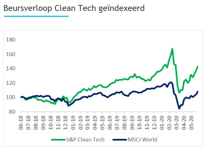 De rest van het geld uit Next Generation EU zal goed uitpakken voor de anticiperende bedrijven die zich al in sectoren bevinden die met de mitigatie van de klimaatverandering te maken hebben. Te denken valt aan de renovatiegolf die is opgenomen in de “Green Deal”, waarbij isolatiebedrijven profijt zullen hebben van investeringen in de vergroening van de bestaande bouw en de eisen aan nieuwbouw. Ook voor infrastructuur is vergroening noodzakelijk. Andere voor de hand liggende sectoren zijn fabrikanten van zonnepanelen, windturbines en beheerders of bouwers van elektrische auto’s. Daarnaast wordt er nog nadruk gelegd op de digitalisering van Europa en bijvoorbeeld een snelle uitbouw van de 5G-netwerken in de hele Unie; bedrijven die zich nu al als frontrunner profileren voor de uitbouw van 5G zullen van het pakket kunnen profiteren. Veel van de upside in dit segment is reeds ingeprijsd of zal snel ingeprijsd zijn door de markt, zeker als er gekeken wordt naar beursverloop van groene voorlopers, waar de impact van corona op de beurswaarde bijna niet meer waarneembaar is. Dit fenomeen is al een tijdje aan de gang. In de onderstaande grafiek staat dat een index die volledig bestaat uit cleantech-bedrijven het significant beter heeft gedaan dan de wereldwijde brede marktindex. Het lijkt er dan ook op dat de markt al heeft geanticipeerd op de overheidsstimulans richting deze bedrijven en de impact daarvan op de winstgevendheid.