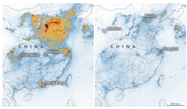 Bron: NASA/ESA, nitrogen dioxide (NO2) links: 1 januari 2020, rechts eind februari 2020.