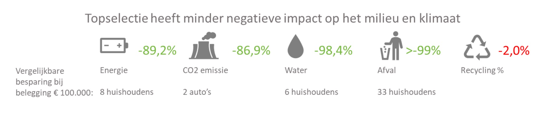 Natuurlijk houden we de duurzaamheid van de topselectie ook in de gaten. We berekenen de footprint van de bedrijven per miljoen omzet die gemaakt wordt. Vervolgens kunnen we die footprint per bedrijf berekenen op portefeuille niveau en vergelijken met de footprint van de MSCI Wereld index. De tabel laat zien dat de negatieve impact van de aandelen in de topselectie veel minder is dan die van een gemiddeld aandelenmandje. Het laat ook zien dat je als belegger behoorlijk impact kunt maken. Bij een belegging van € 100.000 is de bespaarde energie over jouw belang in die bedrijven vergelijkbaar met het energiegebruik van 8 huishoudens.