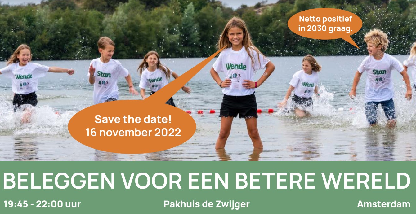 Stan&Wende organiseert, samen met Portaal Duurzaam Financieel, hét duurzame beleggingsevent van 2022 op woendagavond 16 november. Met een avondvullend en interactief programma in Pakhuis de Zwijger in Amsterdam. Met bijdrages van diverse topsprekers zoals Nikki Trip (o.a. Impact Economy Foundation), Karin van Dijk (ASN Impact Investors) en Daan Spaargaren (PME Pensioenfonds-expert verantwoord beleggen). Een avond boordevol inspiratie en volop ruimte voor kritische noten en scherpe vragen rondom het beleggingsthema voor de komende jaren: Netto positief in 2030!