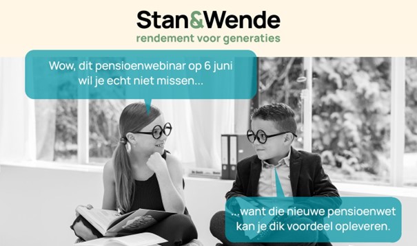 Kortom: meer dan genoeg om een webinar mee te vullen! Dat doet Stan & Wende dan ook: een speciaal pensioenwebinar op dinsdagavond 6 juni van 20.00 tot 21.00 uur.