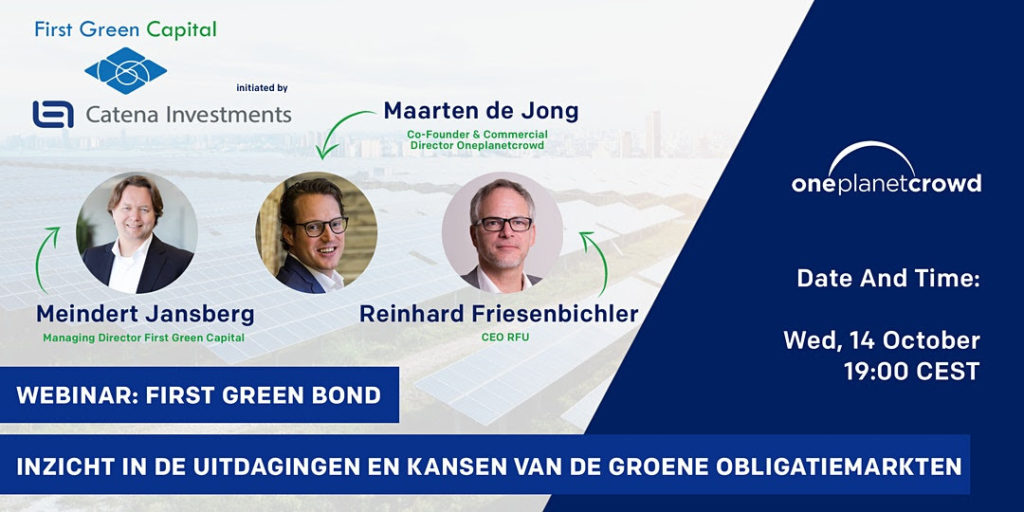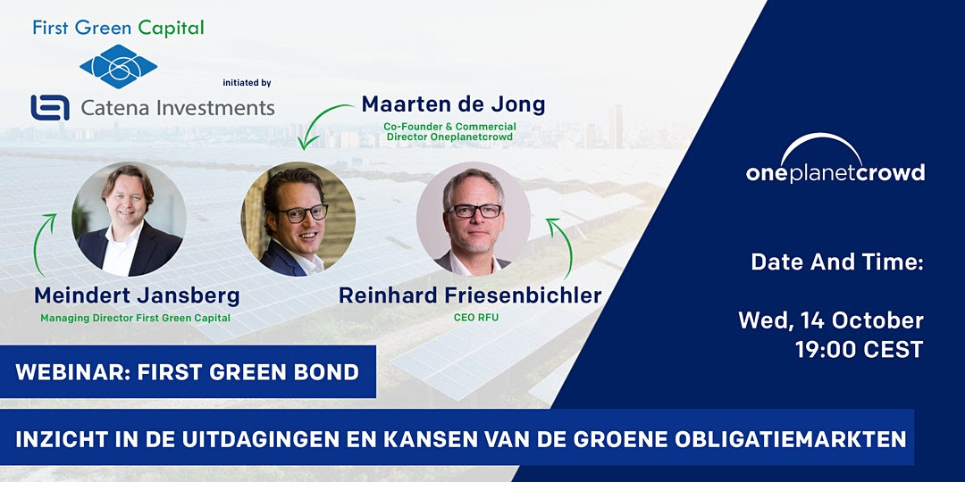 Samen met partner Nxchange biedt Oneplanetcrowd u momenteel de mogelijkheid om te investeren in de groene obligaties van First Green Capital. Tijdens dit webinar vertellen Maarten de Jong (commercieel directeur Oneplanetcrowd) en Meindert Jansberg (CEO First Green Capital) u over dit nog relatief nieuwe product. Wat zijn Green Bonds? In het geval van First Green Capital, waar investeert u precies in? Daarnaast vertelt de Oostenrijker Reinhard Friesenbichler van RFU over de duurzaamheidsbeoordelingen die zij uitvoeren voor beursgenoteerde groene obligaties in Europa. Hoe komt een score tot stand? Tot slot komt aan bod hoe het investeringsproces op NxChange eruit ziet. Tussendoor wordt voldoende tijd besteed aan het beantwoorden van uw vragen.