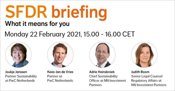 Join us in an interactive webinar with Joukje Janssen and Kees-Jan de Vries, specialists in sustainable finance regulation and reporting at PwC, and NN IP’s Chief Sustainability Officer Adrie Heinsbroek and Judith Boom, Senior Legal Counsel Regulatory Affairs, on 22 February.