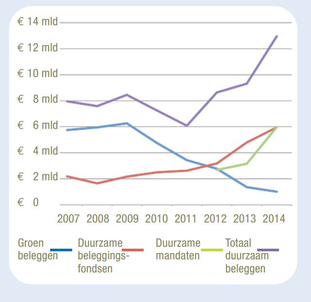 Historische ontwikkeling duurzaam beleggen (2007-2014) x 1 miljard euro (bron: VBDO)